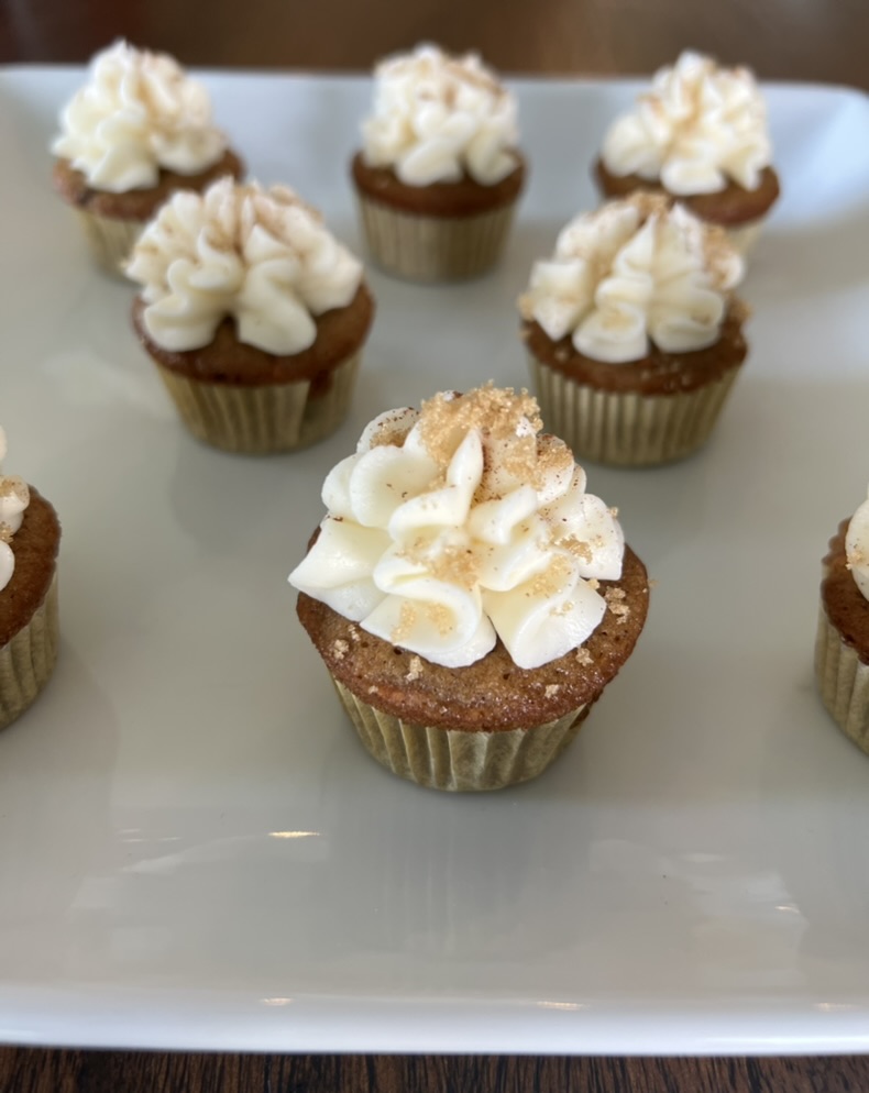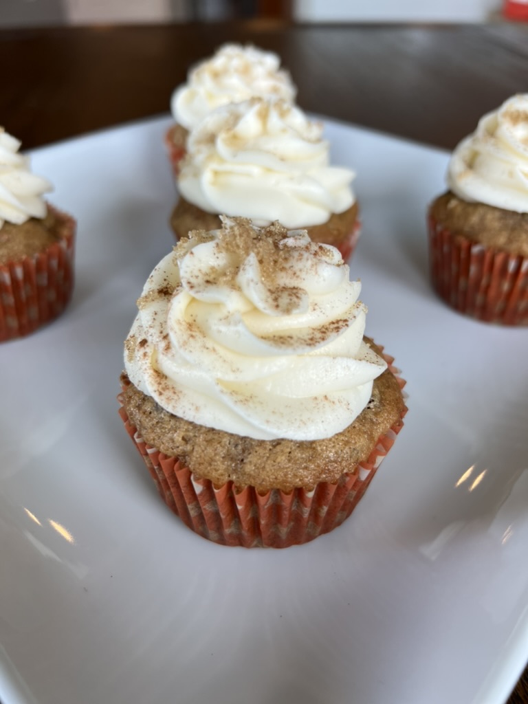 Carrot cake cupcakes with cream cheese buttercream frosting and a brown sugar / cinnamon dusting on top.